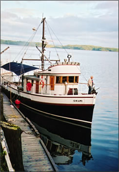 Telegraph Cove has been the Gikumi‘s home since it was built in 1954 for Fred Wastell, the owner of the sawmill and the whole town until his retirement in 1980. Its native name comes from the Kwakwala language and means ‘The Chief.’ This stable 60 footer, complete with miniature galley and lots of polished brass and warm wood, was originally built to tow logs to the sawmill in Telegraph Cove, though it also carried lumber and dry goods all over the British Columbia coast.